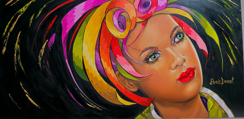 Ses cheveux bouclés, très colorés expriment une forte énergie et des émotions à travers son regard évasif. / Her curly, brightly colored hair expresses strong energy and emotions through her evasive gaze.